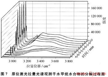 圖5是原位激光拉曼光譜測定冰融化過程的譜圖,從該譜圖中可以看到,隨著系統(tǒng)溫度的不斷升高,冰的四面體結構逐漸瓦解,氫鍵數目逐漸減少,峰包的高波數側不斷上揚,而低波數端不斷消亡,從該譜圖上看冰的融化過程幾乎是水結冰的逆過程。