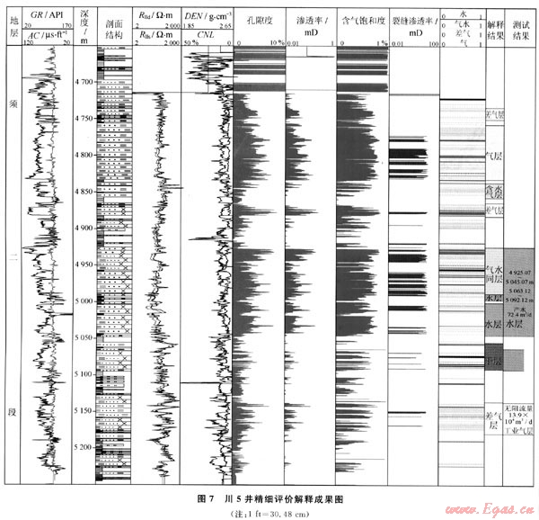 將上述方法得到的定性、定量結(jié)果進(jìn)行綜合分析評(píng)價(jià),并結(jié)合測(cè)試結(jié)果,可對(duì)儲(chǔ)層進(jìn)行有效性識(shí)別。圖7是川5井綜合評(píng)價(jià)圖。該井顯示須二段上部?jī)?chǔ)層物性、天然氣、裂縫匹配關(guān)系較好,而含水夾層對(duì)應(yīng)裂縫不發(fā)育段,故解釋該層為氣層,原始狀態(tài)不產(chǎn)水;中上部?jī)?chǔ)層段有含水夾層且對(duì)應(yīng)裂縫發(fā)育,綜合解釋該層為含水氣層;中下部含氣性差,以含水夾層為主,裂縫發(fā)育,綜合解釋該層為含氣水層;下部以含水層為主,綜合解釋為含水層;底部砂層有一定的裂縫發(fā)育,流體局部含氣,綜合儲(chǔ)層參數(shù)綜合解釋為差氣層。測(cè)試時(shí)對(duì)該井進(jìn)行了兩次射孔測(cè)試,第一次對(duì)5157~5180m進(jìn)行測(cè)試,獲天然氣產(chǎn)量8.58×104m3/d;第二次對(duì)4925~5045m和5063~5092m進(jìn)行測(cè)試,結(jié)果產(chǎn)水量72.4m3/d,后經(jīng)生產(chǎn)測(cè)井證實(shí)主產(chǎn)水層為5033~5044m和5073~5091.7m。該井的精細(xì)評(píng)價(jià)結(jié)果得到了很好的地質(zhì)印證[6~7]