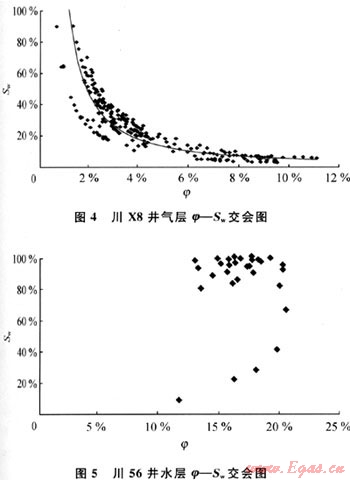 根據(jù)阿爾奇的經(jīng)典公式可以知道:如果儲(chǔ)層只含束縛水,在φ-Sw交會(huì)圖中的交會(huì)點(diǎn)呈近雙曲線分布規(guī)律,說(shuō)明儲(chǔ)層只含束縛水,不含可動(dòng)水,儲(chǔ)層為氣層(圖4);如交會(huì)點(diǎn)不呈近雙曲線分布規(guī)律,說(shuō)明儲(chǔ)層不僅含束縛水,還含可動(dòng)水,儲(chǔ)層為水層或氣水同層(圖5)。