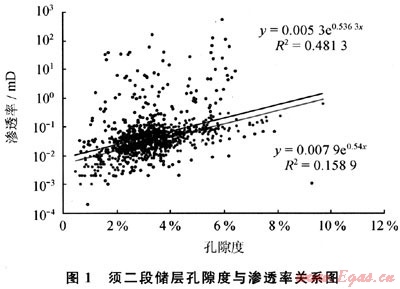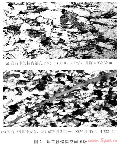 由須二段儲(chǔ)層孔隙度與滲透率的關(guān)系圖(圖1)可見,隨著孔隙度的增大滲透率有變好的趨勢(shì),但孔滲相關(guān)性較差,這說(shuō)明須二段儲(chǔ)層基質(zhì)孔滲相關(guān)性較好,同時(shí)儲(chǔ)層存在一些與孔隙空間關(guān)系較小的額外滲濾通道,這些滲濾通道使得須二段滲透率值的增加對(duì)孔隙度增加的依賴很小。由薄片鑒定可推斷新場(chǎng)須二段儲(chǔ)層的額外滲濾通道為裂縫(圖2)。工業(yè)氣流的產(chǎn)出對(duì)裂縫的依賴程度很高[1~3]。