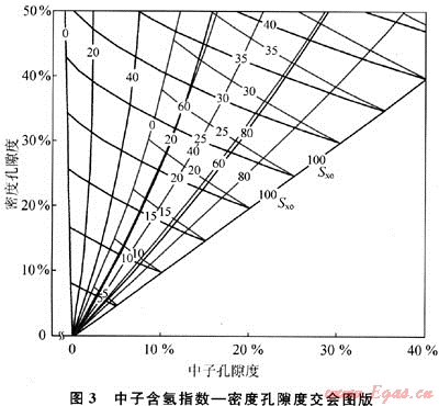 根據(jù)中子測井含氫指數(shù)和經(jīng)骨架密度校正的密度孔隙度,進(jìn)入中子含氫指數(shù)密度孔隙度交會(huì)圖版(圖3),再根據(jù)儲(chǔ)層深度選擇相應(yīng)的關(guān)系曲線族,則由交會(huì)點(diǎn)位置可得到地層孔隙度(φ)。由中子測井含氫指數(shù)及計(jì)算出的密度孔隙度,在此交會(huì)圖可查出其對(duì)應(yīng)的地層孔隙度及沖刷帶含水飽和度(Sxo)。