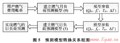 通常,燃?xì)庳?fù)荷的月負(fù)荷預(yù)測模型比較容易建立。因為,通過統(tǒng)計待預(yù)測地區(qū)的月燃?xì)赓M用賬單,就能夠比較方便地建立月負(fù)荷預(yù)測模型。相反,由于目前我國城市燃?xì)庳?fù)荷計量體系尚不完備,因此燃?xì)馊肇?fù)荷計量數(shù)據(jù)的收集較為困難,這也給燃?xì)馊肇?fù)荷的預(yù)測帶來諸多不便。所以我們可以利用上述方法,通過預(yù)測模型(9)來間接地得到燃?xì)馊肇?fù)荷預(yù)測模型,從而實現(xiàn)燃?xì)馊肇?fù)荷預(yù)測。其轉(zhuǎn)換關(guān)系如圖5所示。