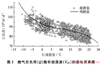 根據(jù)大連市近年來燃?xì)馊肇?fù)荷的觀測數(shù)據(jù),繪制工作日期間燃?xì)馊肇?fù)荷(Q)隨有效溫度(Teff)的變化關(guān)系曲線,如圖2所示。