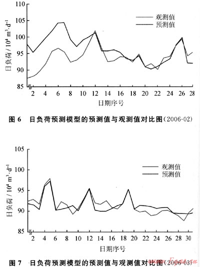 根據(jù)2.1所介紹的方法,分別以2006年2月(最不利工況)和2006年3月(常規(guī)工況)為例,得到燃?xì)馊肇?fù)荷預(yù)測模型的預(yù)測結(jié)果,如圖6、7所示。