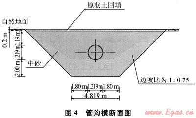 對于圖3中Ⅰ-Ⅰ斷面的管溝,管溝挖深為4.609m,溝底寬度為4.819m,邊坡比為1:0.75,如圖4所示。