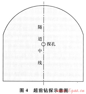 該方法屬于施工過(guò)程中的短距離地質(zhì)預(yù)報(bào)方法,需要采用超前鉆孔進(jìn)行驗(yàn)證。由于西氣東輸二線(xiàn)隧道斷面較小,沿掌子面打超前水平探孔1個(gè)。超前鉆探示意圖如圖4所示。