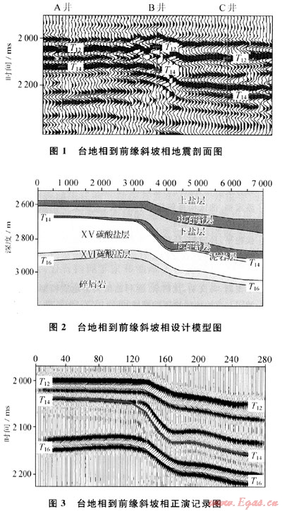 研究區(qū)3口測井資料對碳酸鹽巖頂界(T14)的標(biāo)定結(jié)果見圖1。從圖中可見:臺地相和前緣斜坡相的碳酸鹽巖頂界并不在同一相位上。這對進一步的追蹤和解釋帶來了不確定性。基于區(qū)域地質(zhì)和鉆測井資料分析,設(shè)計了沉積相變區(qū)地震地質(zhì)模型(圖2):臺地相ⅩⅥ碳酸鹽巖層厚度為50~70m,ⅩⅤ碳酸鹽巖層厚度為300~360m,下石膏層厚度為8~15m,下鹽層厚度為70~100m,中石膏層厚度為30~50m;前緣斜坡相ⅩⅥ碳酸鹽巖層厚度為40~60mm,ⅩⅤ碳酸鹽巖層厚度為80~180m,泥巖層厚度為4~38m,下石膏層厚度為20~80m,下鹽層厚度為40~200m,中石膏層厚度為100~140m;中下侏羅統(tǒng)速度為4100m/s,密度為2.40g/cm3;ⅩⅥ碳酸鹽巖層速度為5900m/s,密度為2.75g/cm3;ⅩⅤ碳酸鹽巖層速度為5600m/s,密度為2.65g/cm3;泥巖層速度為4200m/s,密度為2.45g/cm3;下石膏層和中石膏層的速度為6000m/s,密度為2.96g/cm3;下鹽層和上鹽層速度為4500m/s,密度為2.50g/cm3。取Ricker子波作為入射脈沖,依據(jù)實際地震資料選取的地震波主頻為30Hz。通過波動方程正演計算,得到的理論地震記錄見圖3。
