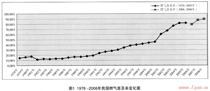 我國燃?xì)馄占奥?%)的匯總計算,在不同時期有不同的方法,其統(tǒng)計資料一直局限在設(shè)市城市的范圍以內(nèi)(約660~665個),未能統(tǒng)計到的有1636個縣級和17785個建制鎮(zhèn)[1]。實際上,我國的不少縣,甚至建制鎮(zhèn)也有燃?xì)庠O(shè)施,特別是一些沿海地區(qū)。