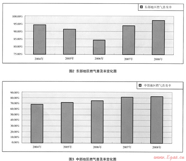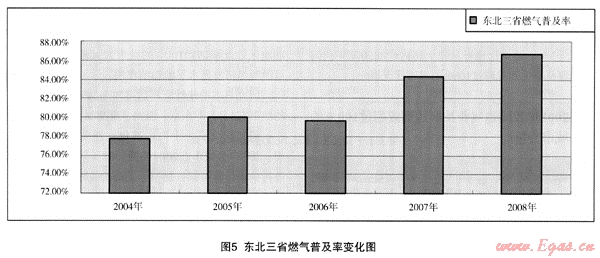(2) 區(qū)域的燃?xì)馄占奥什⒉荒芡耆砀魇?、市、自治區(qū)的燃?xì)馄占奥仕健?008年的情況看,東部地區(qū)的海南省只有73%,而中部地區(qū)的江西省燃?xì)馄占奥试?0%以上,西部地區(qū)的重慶市也在90%以上。因此,作為規(guī)劃設(shè)計的重要計算數(shù)據(jù)使用時,還應(yīng)該進(jìn)行具體分析,但東部地區(qū)普及率應(yīng)該在全國的平均數(shù)以上。