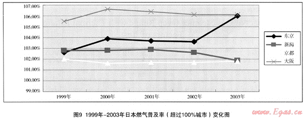 日本東京、新潟、京都、大阪1999年—2003年的燃?xì)馄占奥?,見?,變化狀況可見圖9。