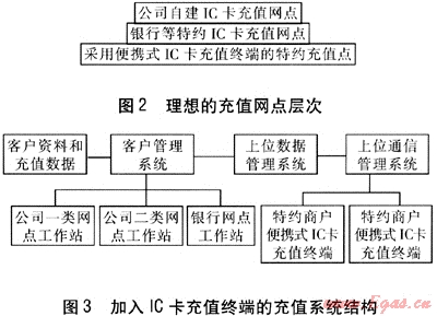 為了保證客戶能夠方便地充值,必然要增加充值網(wǎng)點(diǎn),全部由公司自建對公司而言是一個沉重的負(fù)擔(dān)。對于客戶,能夠方便地進(jìn)行充值是其最需要的服務(wù)。因此,充值網(wǎng)點(diǎn)社會化應(yīng)是一種趨勢。理想的充值網(wǎng)點(diǎn)層次見圖2。上層是公司自建的IC卡充值網(wǎng)點(diǎn),成本最高,數(shù)量最少,可開展的業(yè)務(wù)類型較多,是公司直接對外的窗口。中間層是借助銀行等網(wǎng)點(diǎn)而建立起來的IC卡充值網(wǎng)點(diǎn)。底層是采用便攜式IC卡充值終端的住宅區(qū)物業(yè)、小型商場、商店等廣泛分布的公司特約充值點(diǎn),成本最低,數(shù)量最多。加入IC卡充值終端的充值系統(tǒng)結(jié)構(gòu)見圖3。