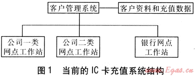各網(wǎng)點(diǎn)通過我公司開發(fā)的充值系統(tǒng)進(jìn)行充值。各網(wǎng)點(diǎn)建立一個小型局域網(wǎng),該局域網(wǎng)通過數(shù)字線路或ADSL+VPN的形式與公司局域網(wǎng)相連,在各網(wǎng)點(diǎn)的計算機(jī)上安裝充值系統(tǒng)客戶端,通過客戶端進(jìn)行IC卡充值,并與公司服務(wù)器的客戶管理系統(tǒng)進(jìn)行通信。當(dāng)前的IC卡充值系統(tǒng)結(jié)構(gòu)見圖1。