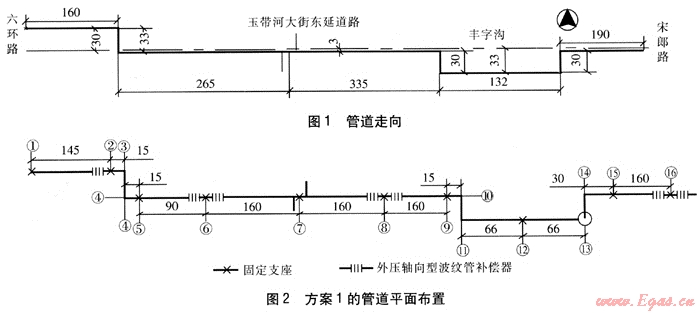 將方案1中節(jié)點(diǎn)1~15與方案2進(jìn)行對(duì)比可知,方案1共有固定支座10個(gè),其中2、5、9、15為大推力固定支座,而方案2在平面轉(zhuǎn)角處利用鉸鏈型波紋管補(bǔ)償器,加大補(bǔ)償段長(zhǎng)度,并在中間長(zhǎng)直管段上利用管道穿越障礙埋設(shè)較深的條件,設(shè)置豎向方形彎利用鉸鏈型波紋管補(bǔ)償器補(bǔ)償直管段熱伸長(zhǎng),減少了大推力固定支座數(shù)量。