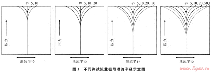 由式(2)可以看出,對(duì)每一個(gè)測(cè)試流量來說,隨著時(shí)間的進(jìn)行,壓降變化越來越小,當(dāng)達(dá)到一定測(cè)試時(shí)間后,由于壓降變化非常小,超出探測(cè)裝置的可探測(cè)范圍,此時(shí)可以近似看作達(dá)到相對(duì)穩(wěn)定狀態(tài),泄流半徑不再擴(kuò)大,且各測(cè)試流量達(dá)到相對(duì)穩(wěn)定狀態(tài)的時(shí)間與測(cè)試流量的大小及儲(chǔ)層的物性密切相關(guān),圖1表示了測(cè)試流量依次增大,其極限泄流半徑也相應(yīng)增大。