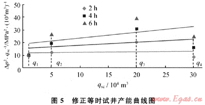 根據(jù)試井?dāng)?shù)據(jù)繪制了qsc-△p2/qsc產(chǎn)能曲線(圖5)。