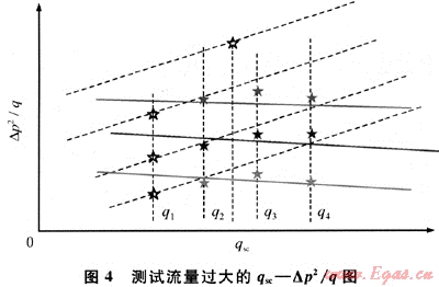 測(cè)試流量過大會(huì)導(dǎo)致地層能量供應(yīng)“滯后”,這種影響體現(xiàn)在隨著時(shí)間進(jìn)行,供氣半徑不擴(kuò)大,形成“局部供氣”現(xiàn)象,造成流壓快速下降,以致產(chǎn)能曲線上測(cè)量定點(diǎn)偏離正常曲線,甚至出現(xiàn)負(fù)斜率問題(圖4)。