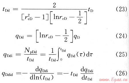 在繪制典型曲線(xiàn)前,對(duì)無(wú)量綱時(shí)間和無(wú)量綱產(chǎn)量進(jìn)行變換,引入如下變量[6]: