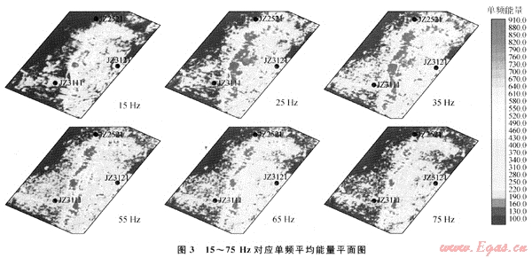 利用基于廣義S變換的頻譜成像儲層預(yù)測技術(shù)對JZ31-6構(gòu)造東二下段北部濁積體開展了研究。利用頻率掃描結(jié)果分析東二下段北部濁積體整體和局部單頻能量強(qiáng)弱的變化,進(jìn)而了解砂體整體和局部特征如厚度、砂體尖滅邊界等。圖3為東二下段北部濁積體從15Hz到75Hz對應(yīng)單頻平均能量的平面圖,顏色越紅表示能量越強(qiáng)。從15Hz到35Hz的分頻平面圖反映出了該濁積體厚層和整體特征;從35Hz到75Hz的分頻平面圖,逐步反映出了砂體薄層和局部特征。35Hz的分頻平面圖比較模糊的地反映出了濁積體由3個(gè)局部砂體組成。在更高頻率的分頻平面圖上,更清楚地反映出北部濁積體是由3個(gè)局部砂體組成的。這一預(yù)測結(jié)果已被后來鉆井所證實(shí)。