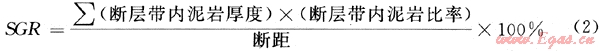 斷層活動(dòng)過程中,由于拖曳、擠壓、研磨和塑性流動(dòng)等作用,沿?cái)嗔逊植嫉臉O細(xì)粒的非滲透性泥狀物,敷著在斷層面上,使斷裂帶具有高的排驅(qū)壓力,增強(qiáng)了斷層的封閉性。反映涂抹效應(yīng)的常用指標(biāo)有多種[1、21~22],主要為斷層泥比率(SGR)、縱向封堵系數(shù)(R)和橫向封堵系數(shù)(F)、泥巖涂抹潛勢(shì)(CSP)等。其中: