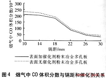 當(dāng)鍋距較小時,粉末冶金多孔板表面溫度較低,造成CO向CO2的轉(zhuǎn)化率降低。鍋距增大,粉末冶金多孔板表面溫度升高,并且二次空氣供給也越充分,因此燃燒就越完全,CO生成量減少。故煙氣中CO生成量隨著鍋距增大而減少。