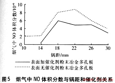 煙氣中NO體積分?jǐn)?shù)與鍋距和催化劑關(guān)系見圖5。從圖5可以看出,在調(diào)節(jié)的鍋距范圍內(nèi),煙氣中NO生成量很低。特別是在鍋距為10~14mm時,由于鍋底溫度低,抑制了NO生成,表面加催化劑的粉末冶金多孔板的煙氣中NO體積分?jǐn)?shù)為0。