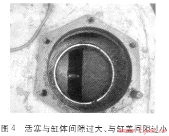 通過幾次大修發(fā)現(xiàn),拆卸的活塞端面與氣缸蓋邊緣有摩擦的痕跡,個別活塞有輕微的裂紋。通過仔細(xì)檢查發(fā)現(xiàn),壓縮機在運行過程中活塞和氣缸的相對位置發(fā)生了變化,慣性沖擊使實際間隙超過了預(yù)先所留的間隙,缸蓋與活塞直接撞擊。圖4是活塞與缸體間隙過大、與缸蓋間隙過小的情況。