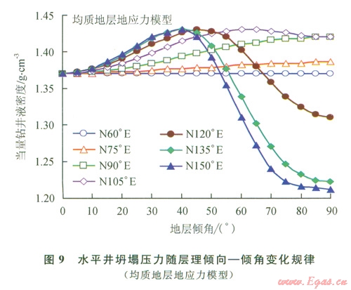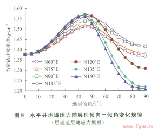 根據(jù)以上控制方程,結(jié)合適當(dāng)?shù)膹?qiáng)度準(zhǔn)則,可以建立不同層理產(chǎn)狀下頁(yè)巖地層水平井坍塌壓力計(jì)算模型。本研究計(jì)算參數(shù)選取如下:ø=33。E=21 GPa、E=25 GPa、ν=0.2、ν'=0.19、G=19 GPa;上覆巖層壓力當(dāng)量密度2.17 gcm3,構(gòu)造應(yīng)力系數(shù)A=0.585、B=0.375,垂深1500 m;水平最大地應(yīng)力方位N60。E,井眼延伸方向?yàn)樽钚〉貞?yīng)力方向,即Nl50。E。