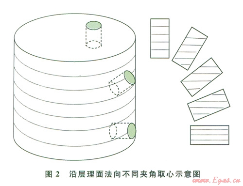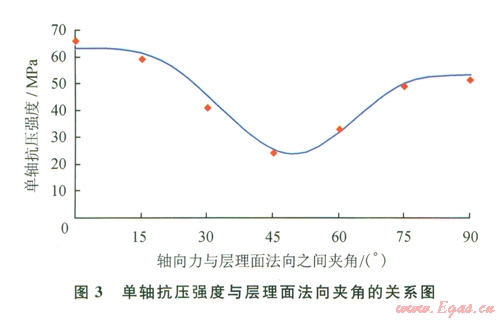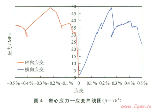 根據(jù)四川盆地某頁(yè)巖地層所取巖心進(jìn)行室內(nèi)強(qiáng)度實(shí)驗(yàn)。用金剛石取心鉆頭在巖心上套取ø25 mm的圓柱試樣,將試樣兩端車平磨光后置于抗油耐壓密封套內(nèi),再裝入MTS強(qiáng)度測(cè)試高壓釜,開(kāi)啟數(shù)據(jù)采集系統(tǒng),緩慢加載測(cè)試單軸抗壓強(qiáng)度。為研究層理面對(duì)頁(yè)巖強(qiáng)度的影響,按照軸線和層理面法向之間的角度(β)0°l5°、30°、45°60°、75°、90°鉆取試樣,示意圖如圖2所示,實(shí)驗(yàn)結(jié)果如圖34所示。