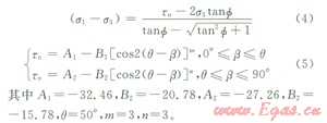 本研究簡(jiǎn)化了JaegerMcLamore[12-13]等人建立的強(qiáng)度準(zhǔn)則,根據(jù)實(shí)驗(yàn)數(shù)據(jù)采取了內(nèi)摩擦角恒定,黏聚力(τ)隨角度變化的頁(yè)巖地層強(qiáng)度公式: