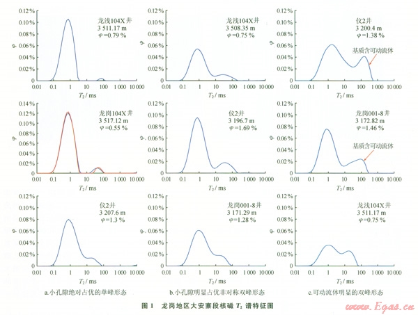 根據(jù)對中國石油西南油氣田公司川中油氣礦測試的秋林1井大安寨段石灰?guī)r壓汞資料的分析,石灰?guī)r基本不具備儲集空間;中國石油西南油氣田公司勘探開發(fā)研究院所作的龍崗地區(qū)大安寨段灰?guī)r的核磁T2譜特征分析結(jié)果,同樣表明其孔隙度極小,而儀2井大安寨段石灰?guī)r孔隙度高,含基質(zhì)可動流體,但卻沒有工業(yè)氣流產(chǎn)出(1)。