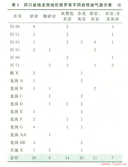 在龍崗地區(qū)川龍63井涼上段井深2 831.42866.0 m的黑色頁巖、細砂巖層段中發(fā)生強烈井噴、井涌,噴高達l7 m,見綠色原油,大一三亞段,井深3 065.53112.0 m介殼灰?guī)r、黑色頁巖層段中發(fā)生油氣浸、井涌,見褐黑色原油;在川65井涼上段井深3 195.63204.8 m的細中粒砂巖、黑色頁巖鉆進中發(fā)生嚴(yán)重氣浸、井噴;在川66井井深2 837.82953.8 m涼上段細粒砂巖、黑色頁巖中發(fā)生油氣浸、井涌,噴高為2 m;在川67井涼上段、大一三亞段、大三段的黑色頁巖、介屑黑色頁巖中發(fā)生油氣浸、間歇井涌,槽面見油花;在川68井涼上段、大一三亞段黑色頁巖、中砂巖、介屑灰?guī)r中發(fā)生油氣浸,并溢出原油l5L;川71井在涼高山組和大安寨段的包括黑色頁巖的地層中共撈出l0多噸原油。龍崗地區(qū)新鉆井中,龍崗9井大安寨段大一下部的油氣顯示井段厚度為4 m,其中頁巖厚度占80%,介殼灰?guī)r占20%,隨后與大一段頂部3 m多厚的介殼灰?guī)r合試,獲日產(chǎn)十多立方米的原油。龍崗2、龍崗6、龍崗26等井在黑色頁巖中也有氣測異常的顯示。最近的龍淺2井在頁巖段也有良好的油氣顯示,并且單層測試獲得工業(yè)氣流。從表l中的統(tǒng)計結(jié)果中可以看出,泥頁巖中的油氣顯示占了總的油氣顯示的13。而龍崗地區(qū)和雙河構(gòu)造已有泥頁巖、介殼灰?guī)r互層的工業(yè)油氣井。