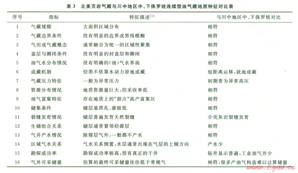 根據(jù)陳更生等[3]總結(jié)的北美頁巖氣藏l6種地質(zhì)特征與川中地區(qū)中、下侏羅統(tǒng)進行對比的結(jié)果如表3所示。表3表明川中地區(qū)中、下侏羅統(tǒng)油氣藏,絕大多數(shù)條件具有與頁巖油氣藏類似的特征。如第9項:油氣富集特征,目前所獲常規(guī)油氣井,正是在“甜點”油氣富集區(qū)處,應(yīng)用常規(guī)(目前逐漸使用一些非常規(guī)的增產(chǎn)措施,如水平井,而酸化壓裂則早已引人使用)鉆井即能獲得工業(yè)油氣流,可以期待,隨著頁巖油氣藏開采技術(shù)的引進應(yīng)用,必將獲得更大的油氣產(chǎn)量;而成藏機制和資源量則需要重新進行研究和評價。