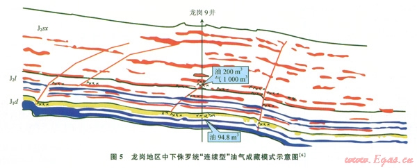 在構(gòu)造較平緩的斜坡帶地區(qū)如龍崗9井或龍崗7井等廣大的區(qū)域,中、下侏羅統(tǒng)的主要烴源巖為涼上段的黑色泥頁巖以及大安寨段的黑色泥頁巖、石灰?guī)r,這些烴源巖生成的烴類,首先由附近的小斷裂或()裂縫(構(gòu)造縫、層間縫)的疏導(dǎo),向就近的涼高山組或大安寨段中的具有一定儲集條件的砂巖中或富有溶蝕孔隙、裂縫的介殼灰?guī)r中運移、聚集。從而形成一些自生自儲型的孤立的巖性或裂縫性油氣藏。