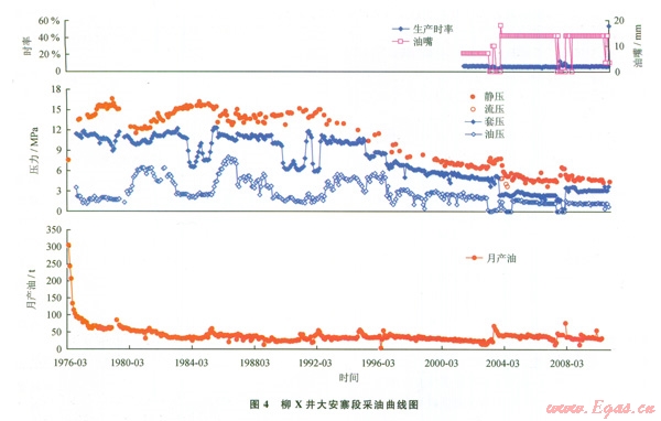裂縫型油氣藏的生產(chǎn)特點是初始產(chǎn)量高、壓力下降快、能量衰減快、生產(chǎn)時間短。從柳X井的采油曲線來觀察,和許多川中地區(qū)其他構(gòu)造侏羅系的采油生產(chǎn)曲線特征相似——初始表現(xiàn)出裂縫型油氣藏的特點:初始產(chǎn)量高、持續(xù)時間短、壓力下降快、連續(xù)生產(chǎn)時間短(該井在2001年之前沒有生產(chǎn)時率的紀(jì)錄,在有記錄的20011-20104月整個生產(chǎn)過程中,生產(chǎn)時率介于2%~l2%,平均時率為6.1%。有些更低者可在2%左右,普遍小于20);但是后期隨著時間的推移(2004年以后生產(chǎn)時率在3%以下),這時生產(chǎn)壓力會在較低壓力處恢復(fù)穩(wěn)定(4),總的生產(chǎn)時間長(有些井間歇性產(chǎn)油可達數(shù)十年,如柳X井:1976-2010年,柳X井大安寨段油氣藏最終累計產(chǎn)原油達數(shù)萬噸)