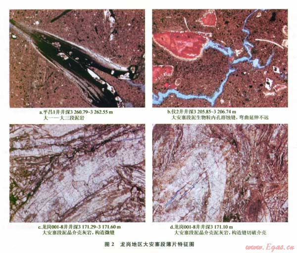 薄片觀察結(jié)果也表明,大安寨段石灰?guī)r、泥晶灰?guī)r以裂縫為主(2-a、b、C、d)。