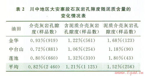 根據(jù)目前已取心鉆井的物性測試,表明大安寨段主要產(chǎn)層段的石灰?guī)r孔隙度極低,大多小于1%,顯示出非儲集層的特征,油氣產(chǎn)出主要是純石灰?guī)r的裂縫起作用。而有測試顯示,泥質(zhì)含量越高孔隙度反而越高,石灰?guī)r越純則孔隙度反而越低,純介殼灰?guī)r孔隙度平均小于l(2)。