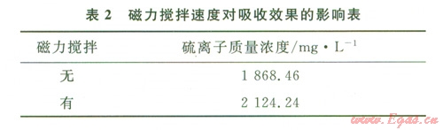在吸收裝置中加有磁力攪拌來(lái)模擬井底流體的擾動(dòng),以期獲得吸收劑盡可能達(dá)到最大吸收效果。由于儀器條件的限制,實(shí)驗(yàn)確定磁力攪拌器的轉(zhuǎn)速以磁轉(zhuǎn)子不產(chǎn)生跳動(dòng)的最大穩(wěn)定轉(zhuǎn)速進(jìn)行實(shí)驗(yàn),結(jié)果見表2。由表2可以看出吸收裝置中是否加有磁力攪拌,對(duì)吸收劑吸收效果影響較大,說(shuō)明流體流動(dòng)形態(tài)對(duì)氣液兩相傳質(zhì)有很大影響。