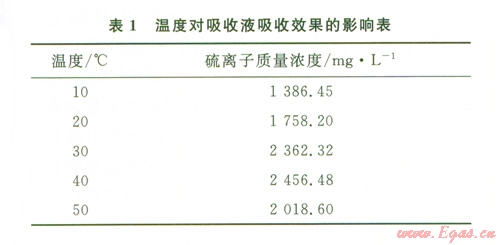 經(jīng)過(guò)多次實(shí)驗(yàn)發(fā)現(xiàn)不同室溫條件下所測(cè)數(shù)據(jù)有較大差異,在其他實(shí)驗(yàn)條件相同的情況下,隨溫度升高,吸收液中硫離子濃度顯著升高。因此在吸收液吸收裝置下加恒溫磁力攪拌器以此調(diào)節(jié)反應(yīng)溫度,并評(píng)價(jià)吸收液吸收效果,結(jié)果見表1。