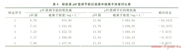 實(shí)驗(yàn)發(fā)現(xiàn),吸收液在吸收硫化氫反應(yīng)后溶液的pH值都低于l0。結(jié)合圖7中所示水溶液中硫化氫存在形態(tài)與溶液pH值的關(guān)系可知:在此pH值范圍內(nèi),吸收液中硫化氫主要以H2S和HS-的形態(tài)存在。分析在這種條件下用碘量法測(cè)得的硫離子含量不能真實(shí)地反映出吸收液中硫離子的含量。因此要在滴定前調(diào)節(jié)吸收液的pH值大于11,在此pH值范圍內(nèi)溶液中硫化氫主要以S2-的形式存在。這樣可以接近真實(shí)的反應(yīng)吸收液中硫化氫的含量。取圖4中1號(hào)吸收液吸收硫化氫反應(yīng)后的溶液,對(duì)比分析pH值調(diào)節(jié)前后的數(shù)據(jù),結(jié)果見表4。