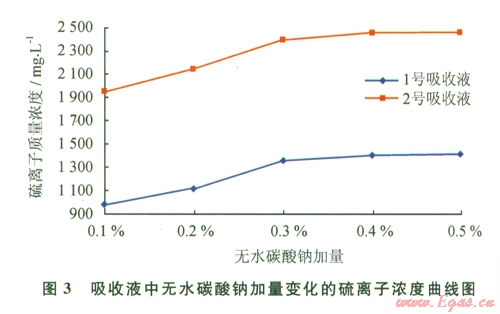 實(shí)驗(yàn)考查無(wú)水碳酸鈉加量對(duì)吸收液吸收效果的影響,制作了兩套吸收液l號(hào)(水+4%膨潤(rùn)土+不同濃度無(wú)水碳酸鈉)、2號(hào)(水+4%膨潤(rùn)土+0.2%除硫劑+不同濃度無(wú)水碳酸鈉)進(jìn)行實(shí)驗(yàn),結(jié)果見圖3、4。