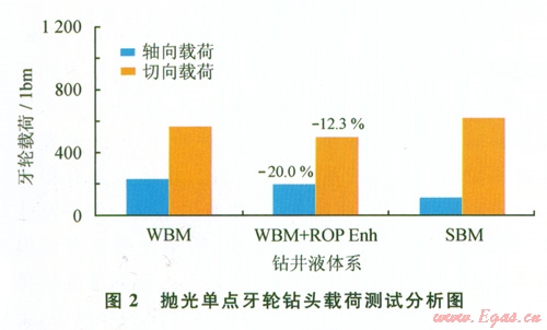 使用后傾角為20°切削深度1.27 mm的鉆頭,在120 rmin的轉(zhuǎn)速下進(jìn)行單點(diǎn)牙輪鉆井模擬試驗(yàn)。牙輪載荷越大,說明發(fā)生的泥包現(xiàn)象越嚴(yán)重。從圖1可見,鉆頭在合成基鉆井液(Synthetic-Based Mud簡稱SBM)中的牙輪載荷最低;鉆頭在水基鉆井液(Water-Based Mud,簡稱WBM)中的牙輪載荷最大;水基鉆井液中加入ROP增速劑后載荷明顯下降,拋光后的鉆頭載荷比未拋光鉆頭的載荷要小得多。測試結(jié)果見圖l2[2]。