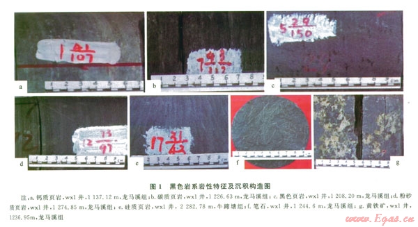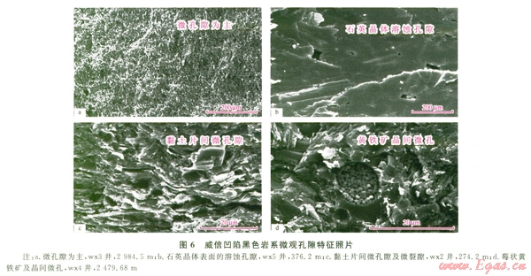 同樣,黑色巖系頁巖中微裂縫發(fā)育有利于改善頁巖的滲透性(6cd)。威信凹陷龍馬溪組黑色巖系頁巖孔隙度和滲透率分別為1.46(0.22%~4.O6)、0.093 mD(0.00000290.70 mD);牛蹄塘組黑色巖系頁巖孔隙度和滲透率分別為0.67(0.3%~l2.7)、0.00037 mD(0.00000080.0041 mD)。對(duì)比可知,龍馬溪組黑色頁巖物性比牛蹄塘組的稍好。