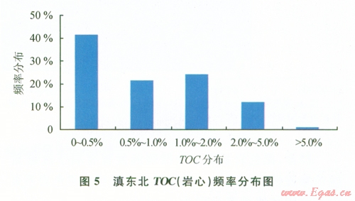 巖心樣品分析揭示,黑色巖系TOC值變化范圍廣,而且下部總體較上部高。本次研究共測(cè)試了9口井的506塊樣品的總有機(jī)碳含量。TOC (巖心)介于0.02%~9.37%之間,平均為097%,TOC頻率劃分為5個(gè)區(qū)間(5),其中,0<TOC<0.5%頻率最高(41.26),05<TOC<1%占21.52%,l<TOC<2%占24.22%,2<TOC<5%占l2.11%,TOC>5%占0.9%。需要說明的是,烴源巖中有機(jī)碳以3種形式存在:烴類中殘余有機(jī)碳;②轉(zhuǎn)化為烴類(可轉(zhuǎn)換碳、活性碳和不穩(wěn)定碳)(Cooles等,l986);③碳質(zhì)殘?jiān)?,不具生烴能力,缺少轉(zhuǎn)化為烴類所需足夠的氫,通常稱為惰性碳、死碳。由于有機(jī)碳的轉(zhuǎn)化作用,所以原始有機(jī)質(zhì)含量比現(xiàn)今殘余有機(jī)碳含量高(TOC),有20[7]36%的差值。