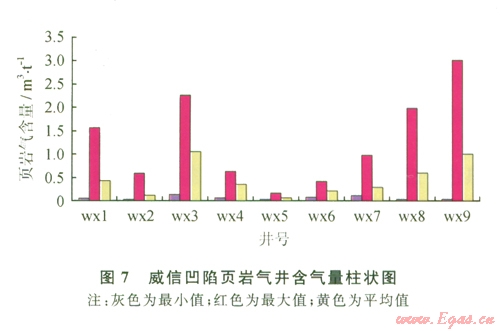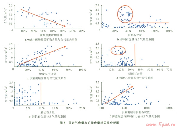 從研究結(jié)果中發(fā)現(xiàn)(8):在寬緩向斜和斷層發(fā)育少的構(gòu)造區(qū)域,頁巖礦物中斜長(zhǎng)石、碳酸鹽巖和黏土礦物(伊利石、綠泥石和伊蒙混層)等含量的大小,影響了頁巖氣含量的高低:伊利石含量介于25%~40%區(qū)間時(shí),頁巖含氣量相對(duì)較高,普遍大于0.5 m3t,伊利石含量大于40%,含氣量普啟遍低于0.5 m3t;綠泥石含量基本小于35%,在15%~25%的區(qū)間內(nèi),含氣量相對(duì)較高;伊利石/蒙脫石混層與伊利石的比值可以反映水分條件的好壞[9],比值越小時(shí)反映水分條件好,反之亦然(水分條件越好,含氣量越低);斜長(zhǎng)石含量大于10%,含氣量普遍低于0.5 m3t;碳酸鹽類礦物含量越高,含氣量越低(例如wx3井碳酸鹽礦物含量平均為30%,與頁巖含氣量呈反比關(guān)系)。