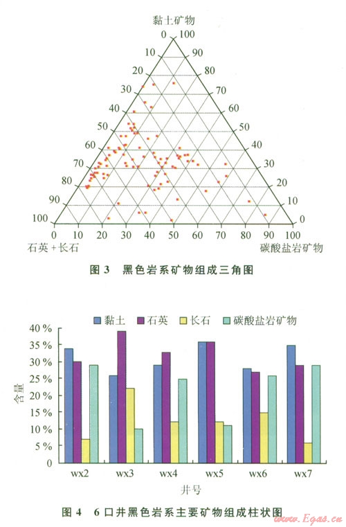 頁巖的礦物組成、有機(jī)碳含量和有機(jī)質(zhì)成熟度是頁巖儲(chǔ)層發(fā)育的3個(gè)最重要因素。滇東北黑色巖系頁巖礦物成分統(tǒng)計(jì)表明(34),6口井(wx2wx3、wx4、wx5wx6、wx7)黑色巖系黏土礦物含量平均值分別為34(4%~55)、26(5%~40)、29(2%~65)、36(12%~53)、28(20%~36)35(3%~82);石英含量平均值分別為30(2%~39)39(9%~50)、33(24%~51)36(11%~52)、27(14%~34)、29(10%~65);長(zhǎng)石平均含量分別為7(2%~l5)、22(2%~32)、12(3%~27)、12(1%~26)、15(1%~22)、6(1%~l5);碳酸鹽巖類(方解石和白云石)平均含量分別為:29(8%~94)、l0(2%~86)、25(3%~48)11(2%~74)、26(5%~55)29(1%~58)。頁巖中的石英呈紋層狀或分散狀分布,顆粒大小介于0.030.05mm,石英主要為陸源碎屑外源成因。