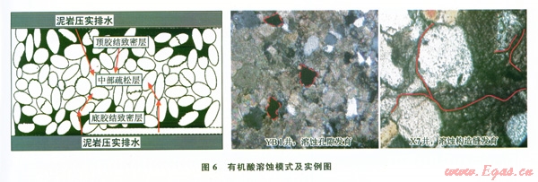晚期有機酸溶蝕作用是指在須三段泥巖壓實過程中排出的有機酸對鈣屑砂巖中的碳酸鹽鹽巖膠結(jié)物以及碳酸鹽巖碎屑顆粒進(jìn)行溶蝕,形成溶蝕裂縫及溶蝕孔隙(圖6)。