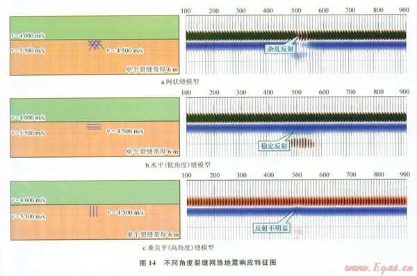 通過不同類型裂縫網(wǎng)絡(luò)模型正演(圖14):網(wǎng)狀裂縫具有典型的雜亂反射特征,而近水平裂縫表現(xiàn)為穩(wěn)定強反射特征,高角度垂直縫沒有明顯地震響應(yīng)。因此,利用“雜亂反射”屬性進(jìn)行須三段裂縫預(yù)測。
