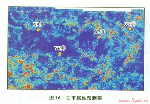 由于須三段儲層的重點勘探目標(biāo)“網(wǎng)狀裂縫”通常具有“雜亂反射”地震響應(yīng)特征,因此,可以利用多種反映地震子波橫向不穩(wěn)定性的地震屬性進(jìn)行裂縫預(yù)測(圖15、16)。