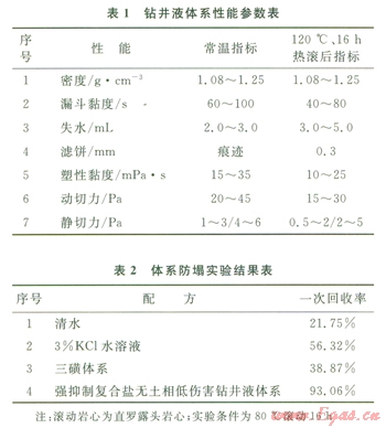 考慮體系總固相含量控制的要求和強抑制性的需要,重點研究了可溶性有機鹽、無機鹽在提高液相密度和鉆井液抑制性的作用,體系防塌實驗結(jié)果見表2。有機鹽溶液自身具有較高的密度,僅其水溶液密度就可超過1.25 9cm3,復(fù)配使用無機鹽就可以提高體系的抑制性,以滿足防塌的要求。另外輔以G302-SZD等即可形成具有較好封堵作用的濾餅,進一步提高體系的防塌效果。