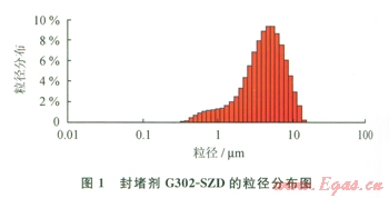 由圖l可以看出,封堵劑G302-SZD的最大粒徑在13μm,主要粒徑分布在25μm,根據(jù)?~2/3的架橋規(guī)則和d90規(guī)則,可以選作封堵漏失喉道[7-8],形成防漏堵漏體系。